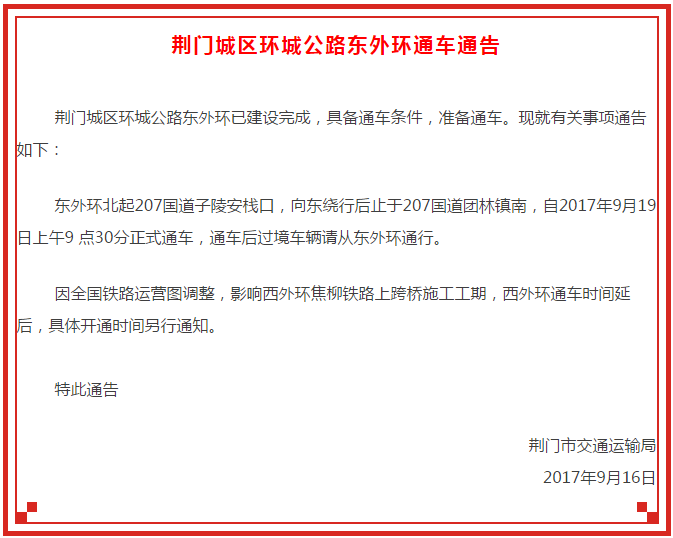 9月16日,be365首页发布《荆门城区环城公路东外环通车通告》,荆门环城公路东外环将于9月19日通车。